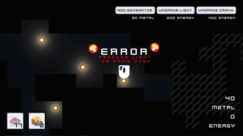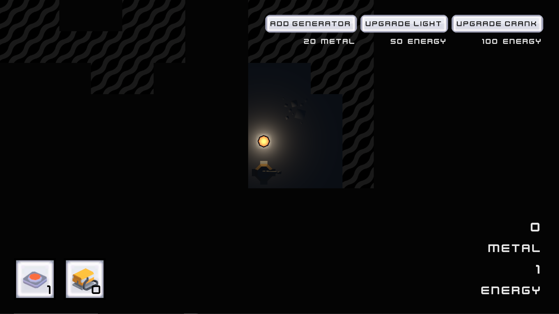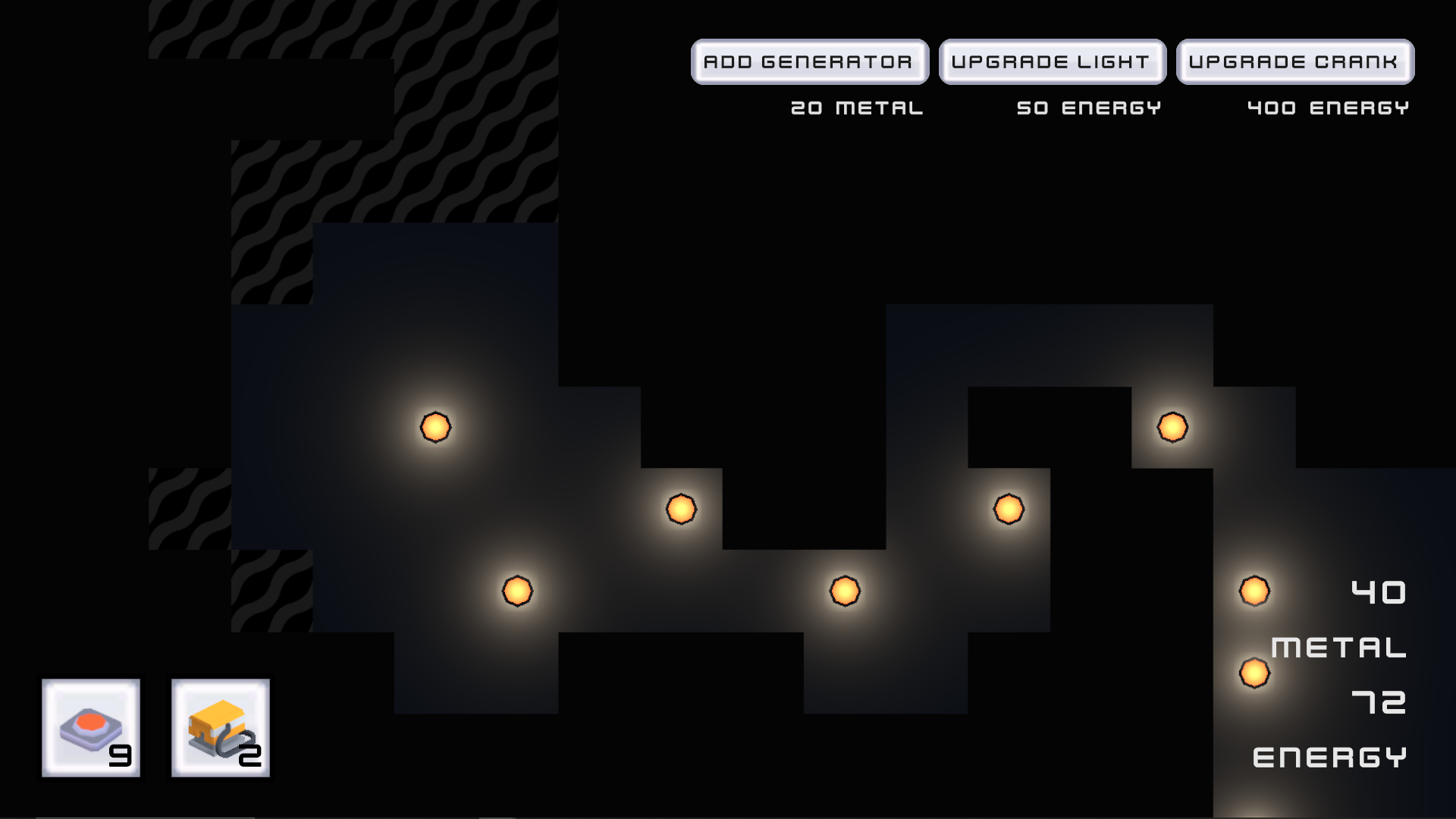 Click on crank to increase energy/power. Use power to place lights and reveal tiles through the fog. Look for metal tiles, and click on them to gather metal resource (very valuable as it allows you to build passive power production with generators!). Metal is finite, and only about 20 metal can be gathered from one ore vein. Be careful and make sure you don't run out of power!